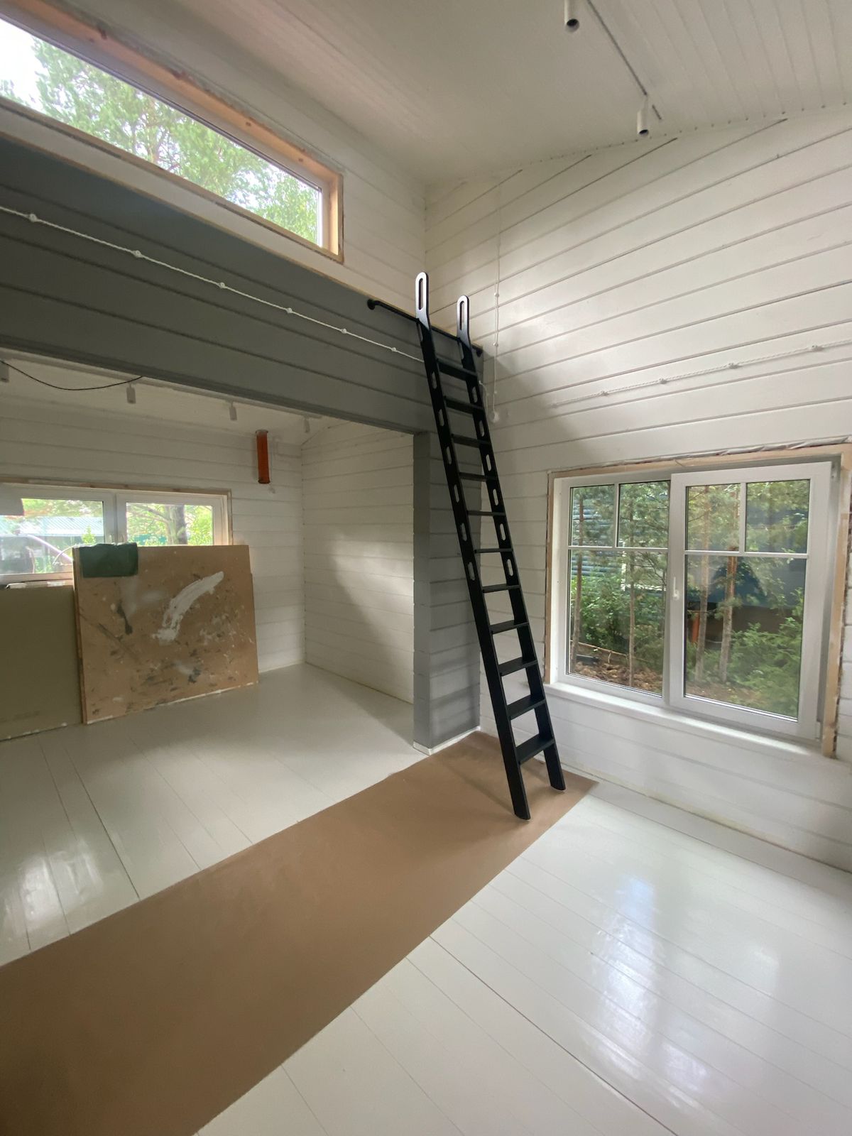 Уникальная убирающаяся лестница из березовой фанеры 21 мм с поручнями и крепежной трубой , складывается одним движением в вертикальное положение.