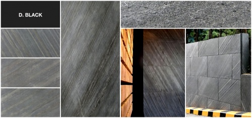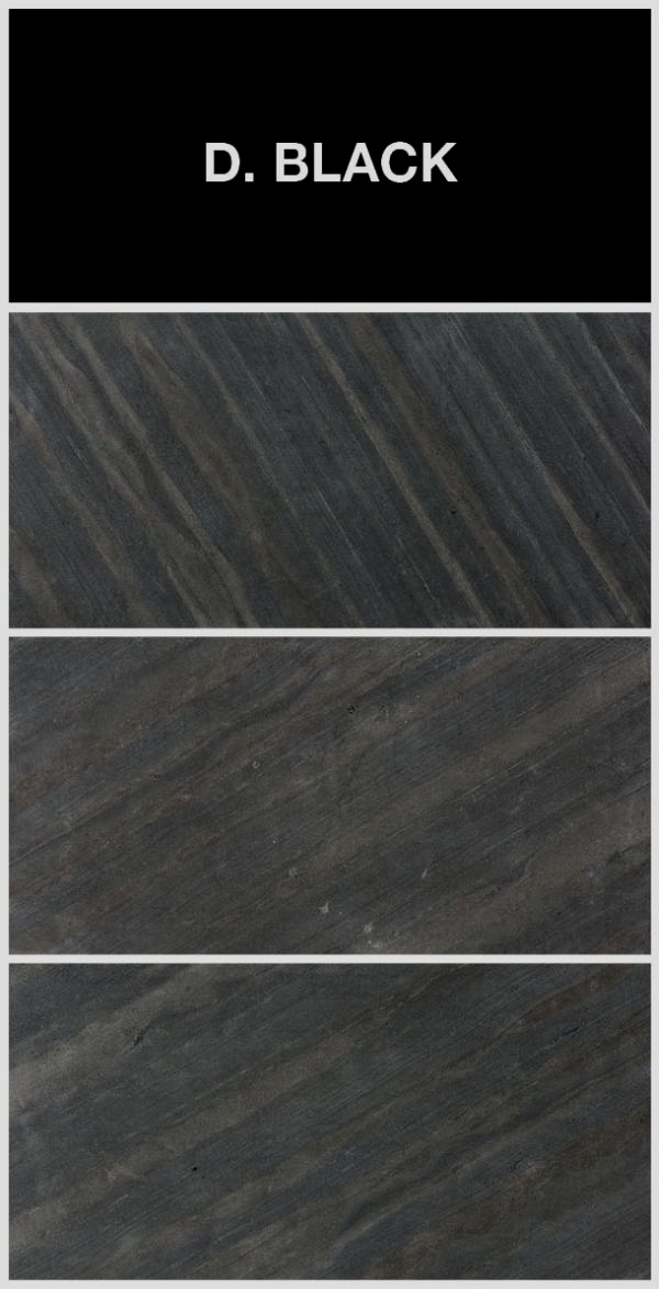 Шпон из глинистого черного сланца. Текстура ярко выражена направлением волн. Партии отличаются друг от друга направлением рисунка «волны» (слева на права, с права налево) и углом наклона.