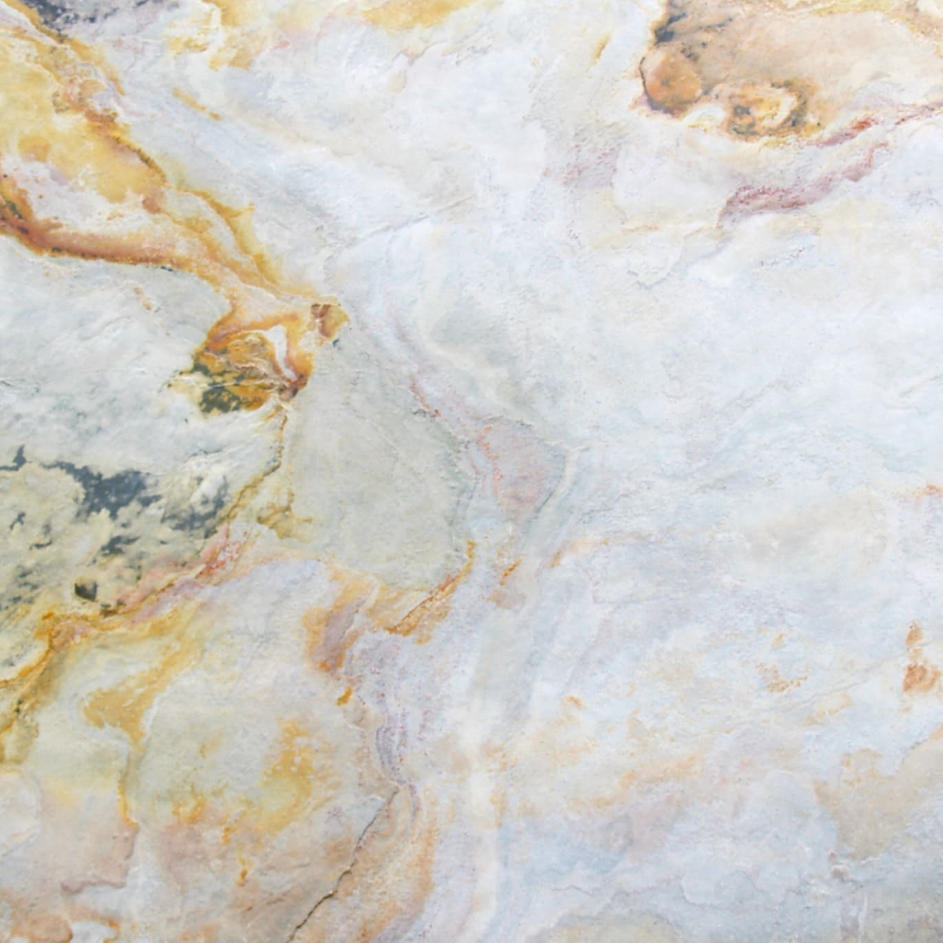 Лист каменного шпона из натурального сланца "бетонного" оттенка с серыми, желтыми и розовыми разводами. Листы покрыты акриловым лаком, и прекрасно защищены от жира, грязи. Достаточно нанести клей Titan classik fix на обратную сторону листов шпона по периметру , отступая 2 см от края и змейкой по всей подложке, прислонить к месту поклейки, оторвать, выждать 2-3 минуты и приложить повторно к стене. Разгладить руками. Вырез под розетки можно сделать заранее, коронками для дерева со стороны подложки. Режем листы шпона паркетной пилой, строительным ножом вдоль металлической линейки 4-5 резов.