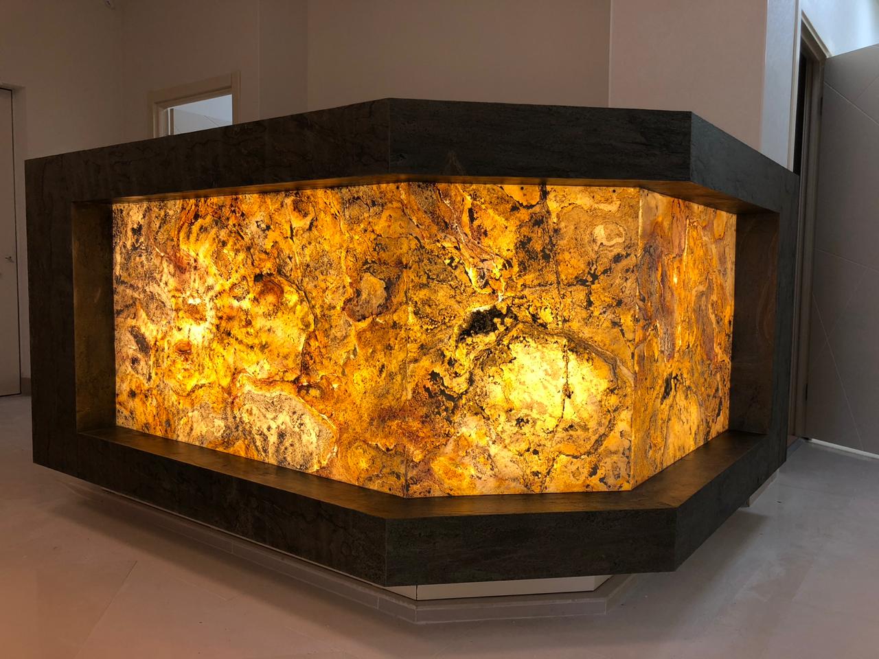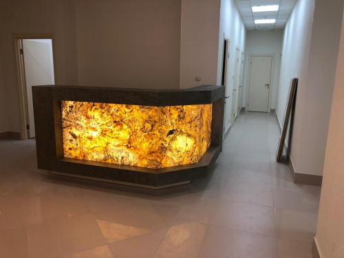 Стойка рецепции изготовлена по чертежам заказчика из ЛДС 16мм. Лицевая часть и столешница облицована на производстве классическим каменным шпоном Berning fores листы 1220*610 (толщина листа 3 мм). 13 листов. Середина стойки освещает панно из прозрачного каменного шпона Failing leves. Для светового панно использовали лист размером 2400*1200. Толщина панно 40 мм. Световые элементы: светодиодная лента 24 В.