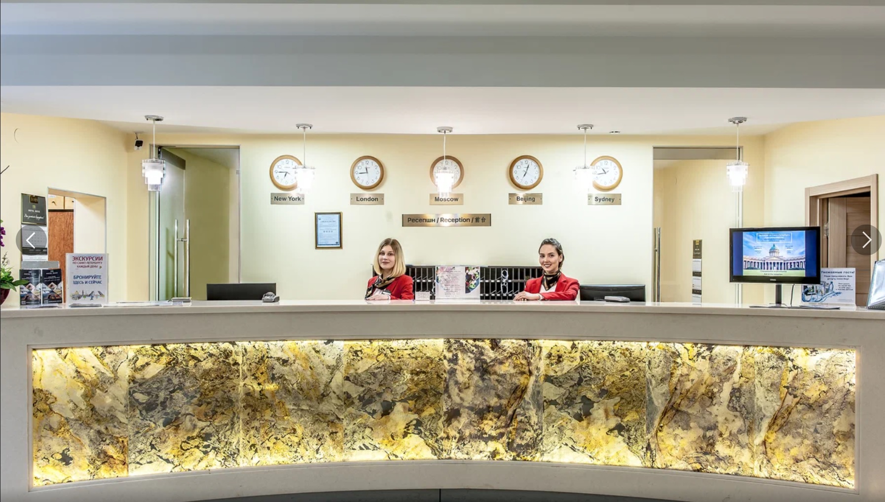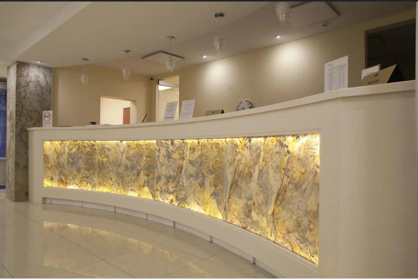 Монтаж светового короба в готовую стойку рецепции в нишу.