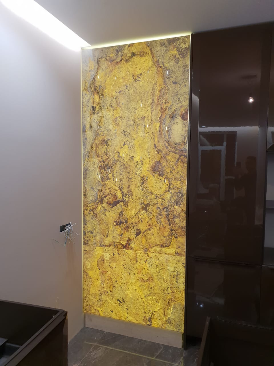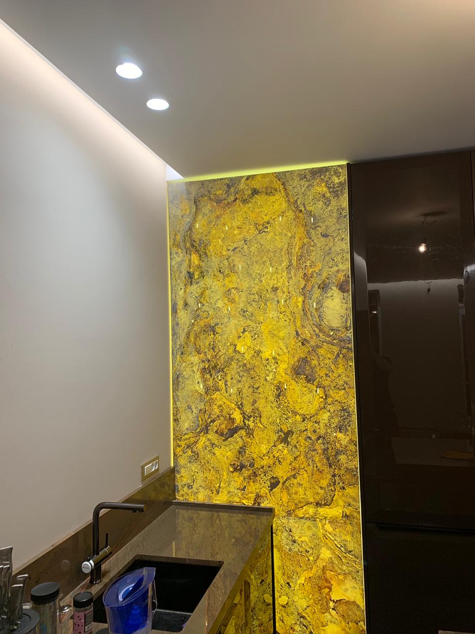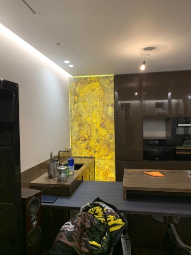 Световое панно из каменного шпона Failing leaves 2200*1200*50 для зоны кухни c креплением для хранения вина.