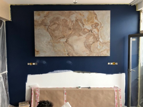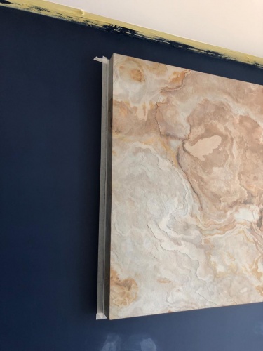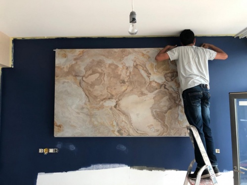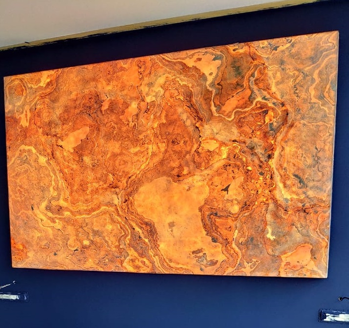Световое панно из каменного шпона Falling leaves. Свет камня прекрасно наполняет спальню теплым солнечным светом, а возможность демирования панно позволяет регулировать яркость и создавать уютную атмосферу.