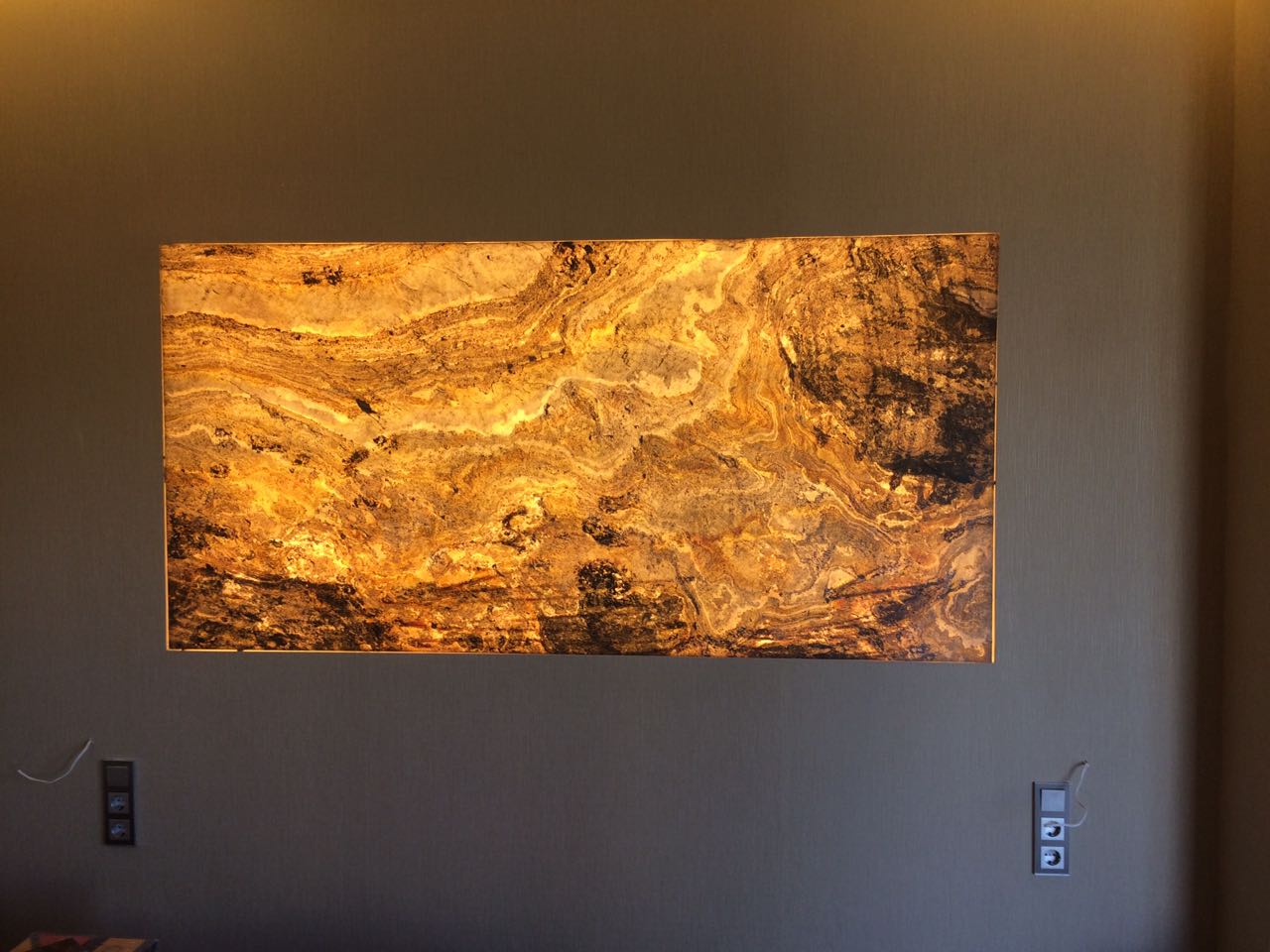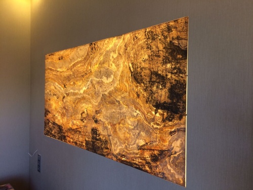 Световое панно из каменного шпона Falling leaves. Свет камня прекрасно наполняет спальню теплым солнечным светом, а возможность демирования панно позволяет регулировать яркость и создавать уютную атмосферу.