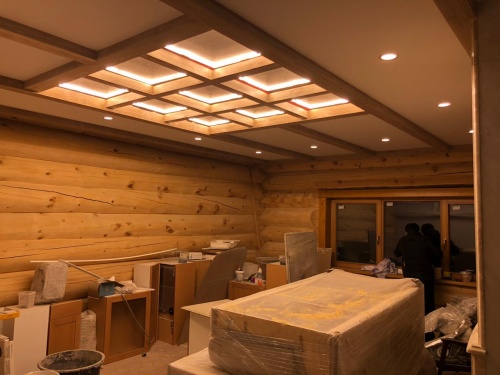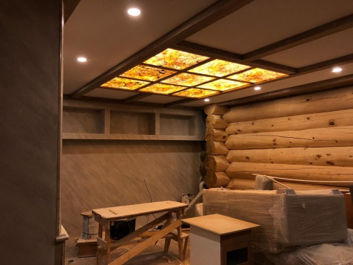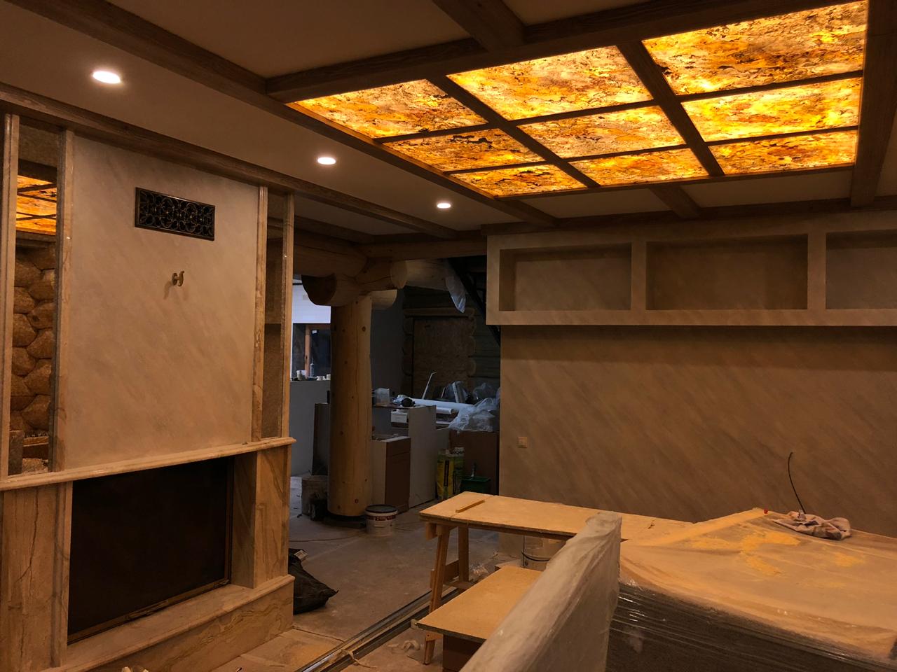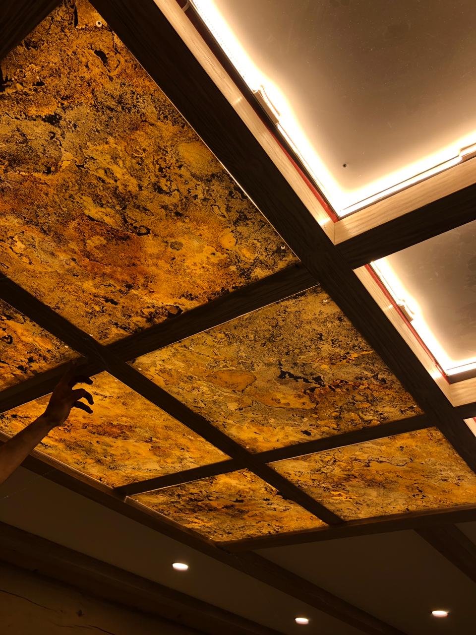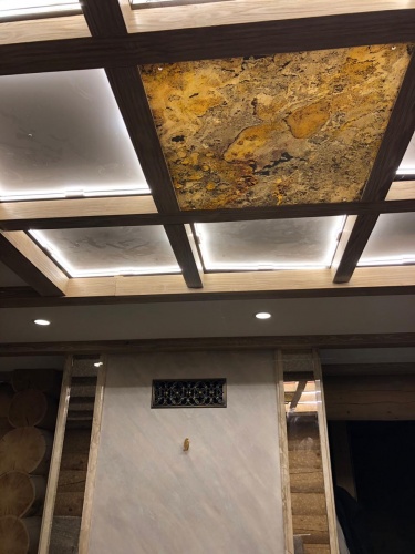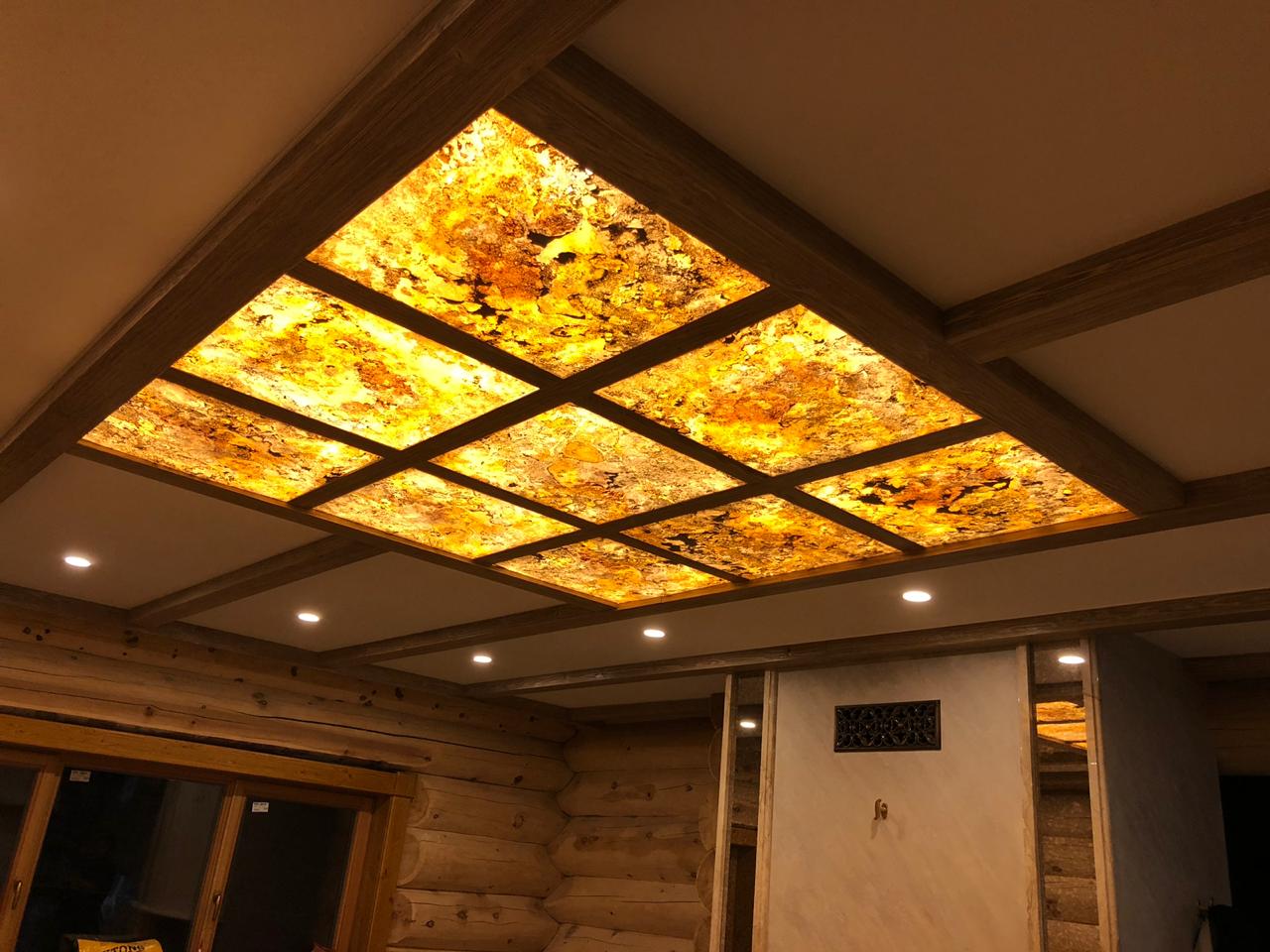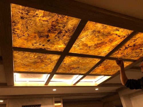 Световое панно из каменного шпона Falling leaves в кессонном потолке, состоит из 9 самостоятельных светильников с пераметральной подсветкой.