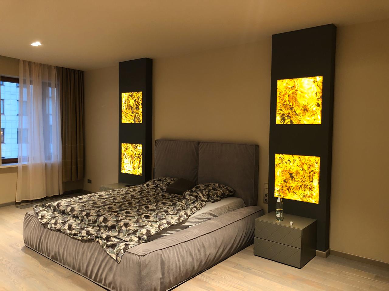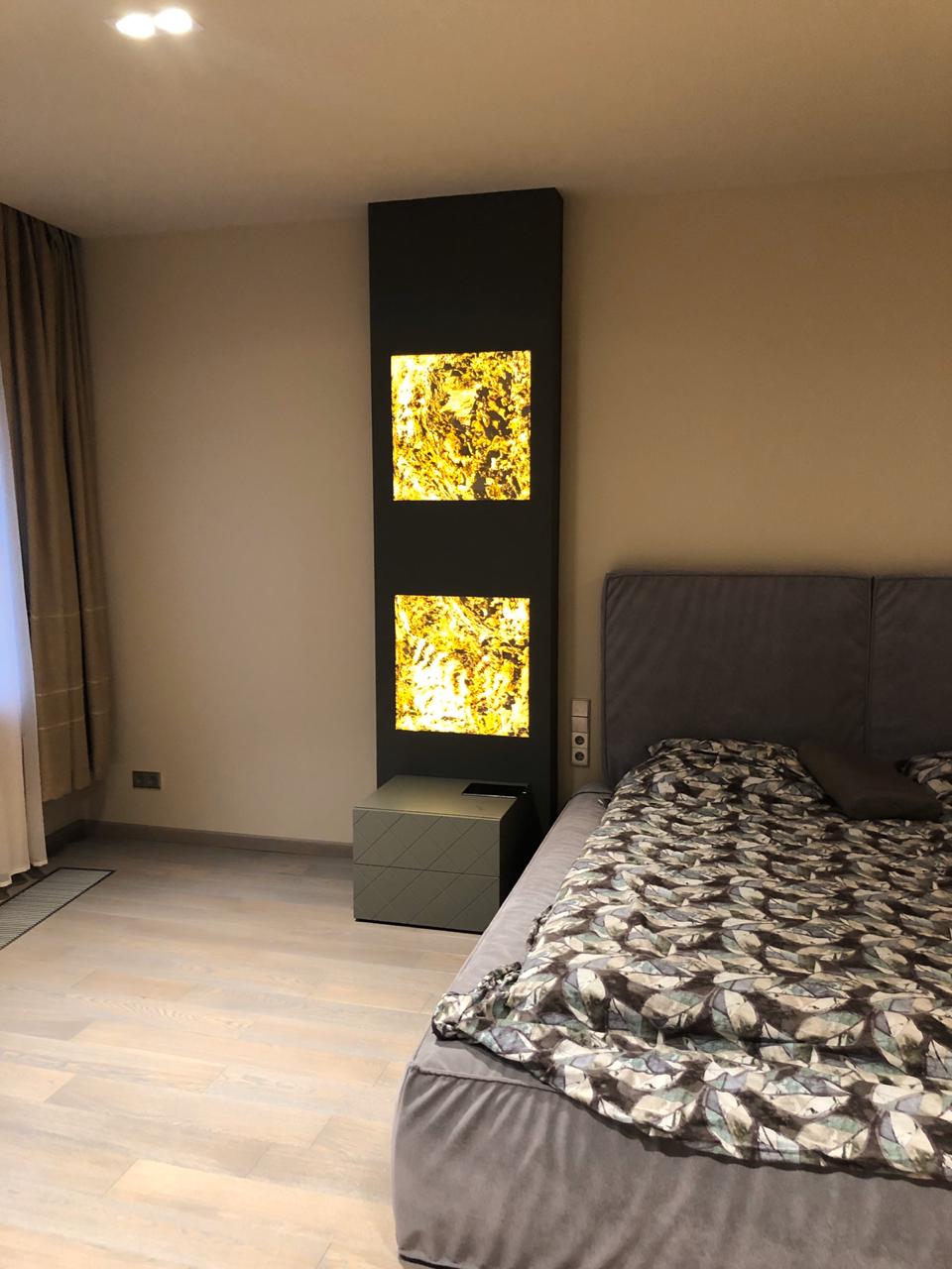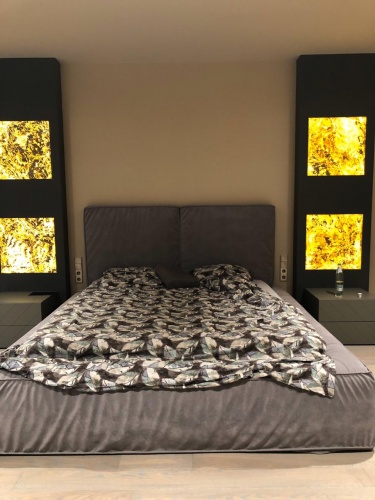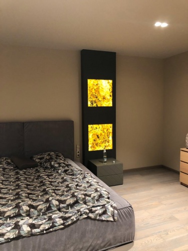 Световое панно из каменного шпона Falling leaves в нише стены спальни, состоит из 4 самостоятельных светильников с пераметральной подсветкой.